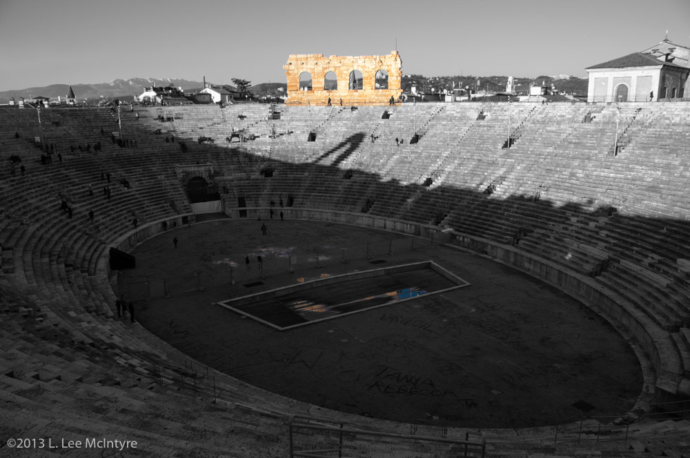 So I played a little bit with an idea Chris suggested to me yesterday about a different photo. Here we have a black and white version of the first photo, but with a little bit of color remaining in the puddle and the part sticking up on L’Arena, which is nicknamed “the Wing”. I thought the colors in the original were a little too flat (the shadow seemed too blue), plus I didn’t like the way that red fence was so prominent. So, played around with the idea of retaining a little of the original color in “Wing” part on the top of L’Arena, as well as in the reflection of it in the puddle.